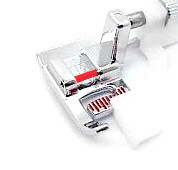 そんな時、こちらの端ミシン押えを使うと、針の落ち位置周辺が良く見えるばかりではなく、ガイドが付いているので、布の縁を沿わせて縫うとステッチ幅を一定にキープしてくれるのです!